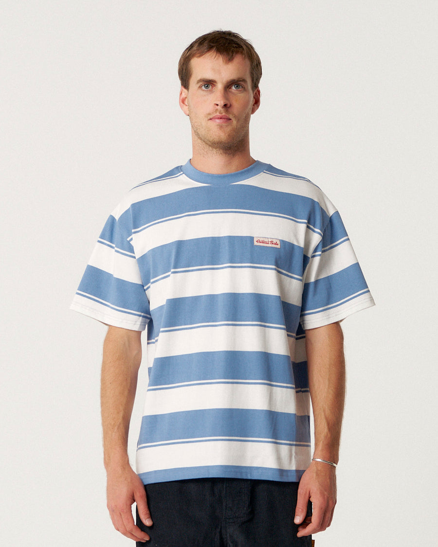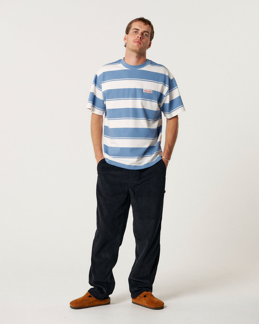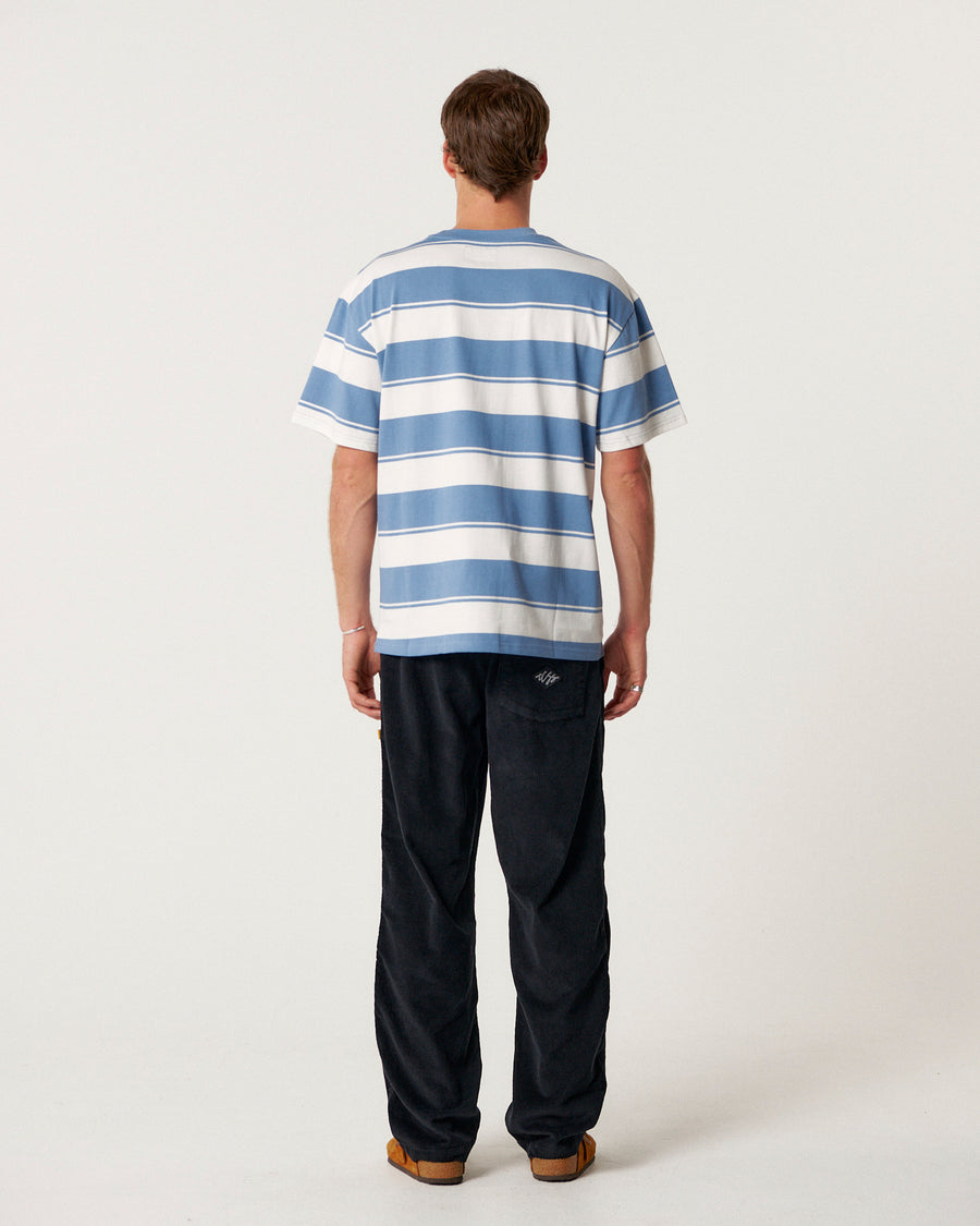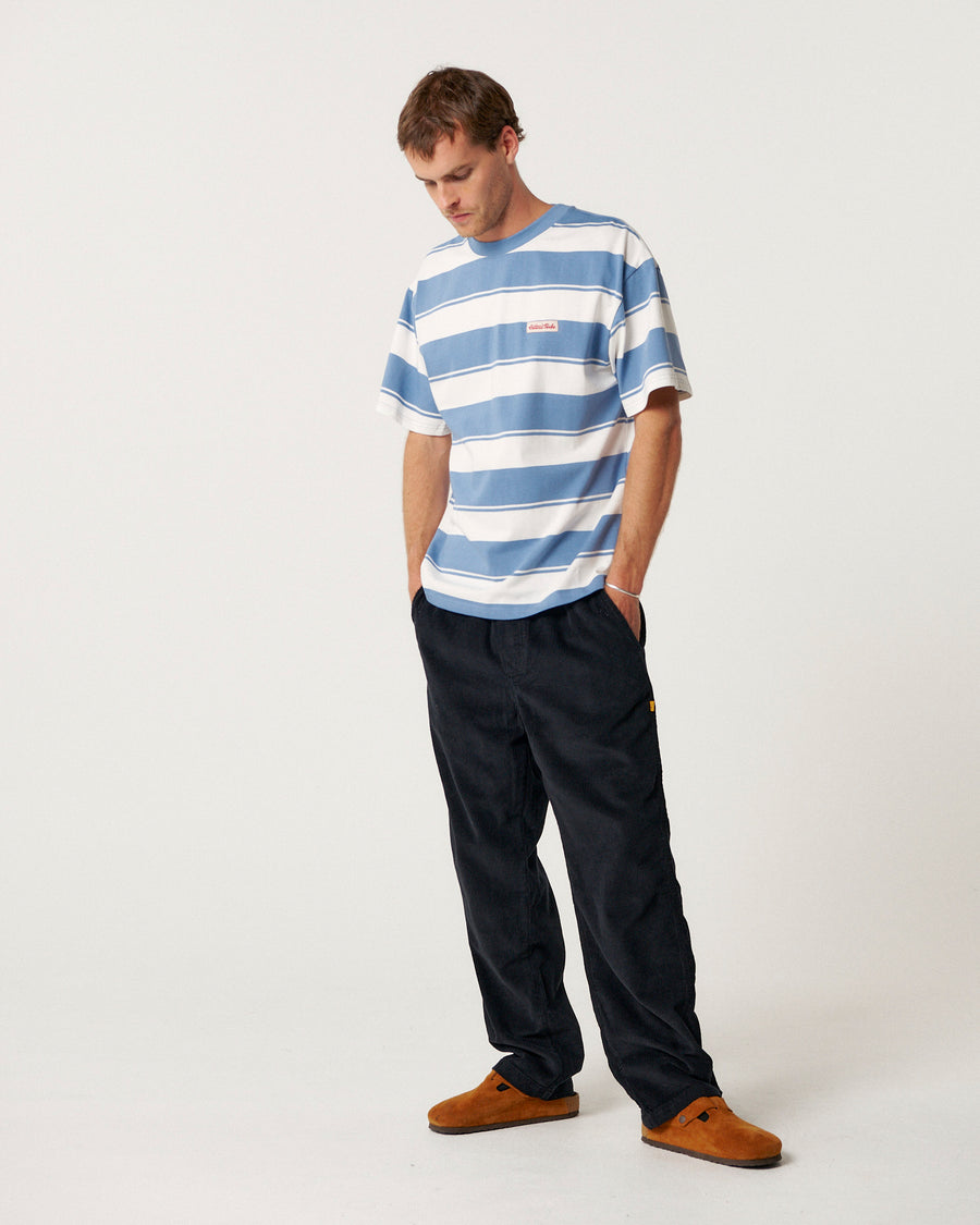 The Kahuna Tee is made from 230gsm cotton singles, washed before and after make to keep shrinkage at an all-time low. Garment dyed so it’ll fade back beautifully with wear. Cut in our regular fit tee—which still runs slightly oversized and drops off the shoulder. Our guy is 6'1" and wearing a Large.